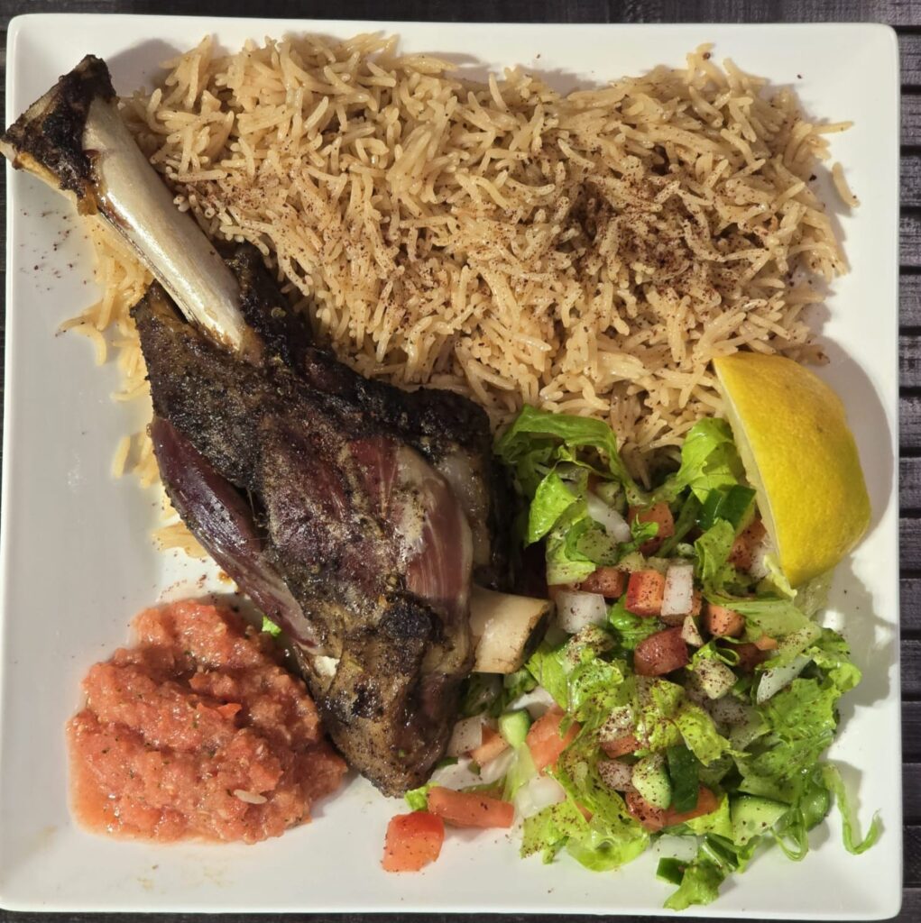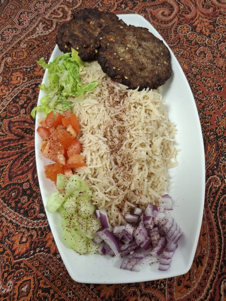 3pcs of Lamb shank, grilled, smoked and cooked on low heat to tender, 6 pcs of Chapli kabobs. Served with rice, Tomato, garlic, mint sauce and salad for 6 persons.